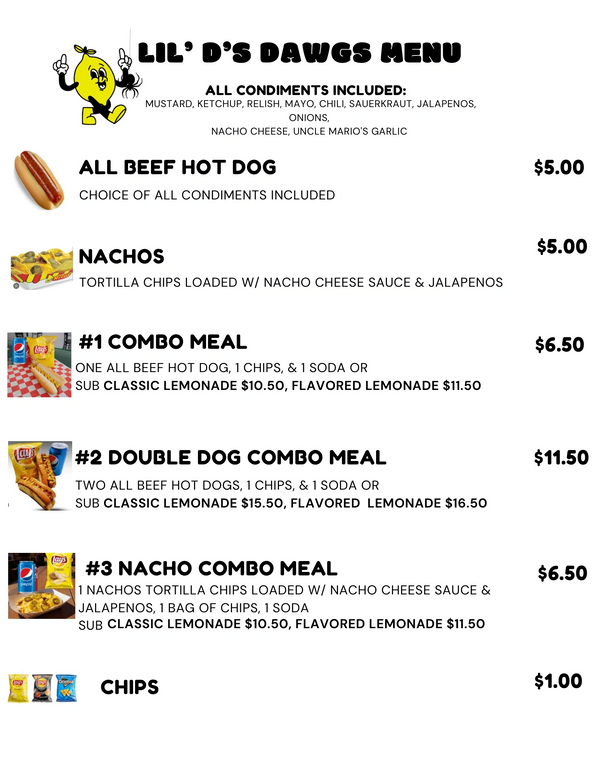 Lil D's Dawgs is a family-owned hot dog cart dedicated to serving the community with delicious, affordable food and a welcoming atmosphere. We proudly support first responders, military personnel, and wildlife rescue organizations, offering special discounts and a pet-friendly environment for all. Our mission is to unite the community through our passion for great food and exceptional service. Catering is also available!
